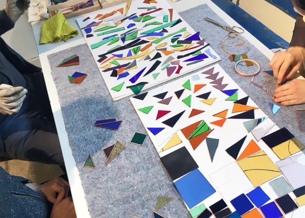 Zur Verfügung stehen hochwertiges Tiffany-Glas, Antikglas, ehemaliger Fensterglas mit Mustern und grafisch bemaltes Klarglas. Ziel ist es, verschiedene Materialien zu mischen und sich die Technik spielerisch anzueignen.