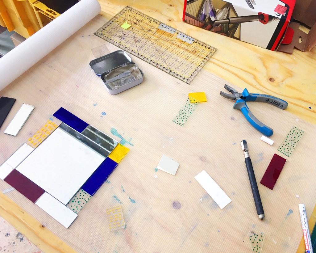 Beim Spiegelworkshop werden farbige Glasstücke wie bei einem Schiebepuzzle immer wieder neu verschoben und angeordnet, bevor sie nach der Tiffany-Technik zu einem stimmigen Ganzen zusammengefügt werden.