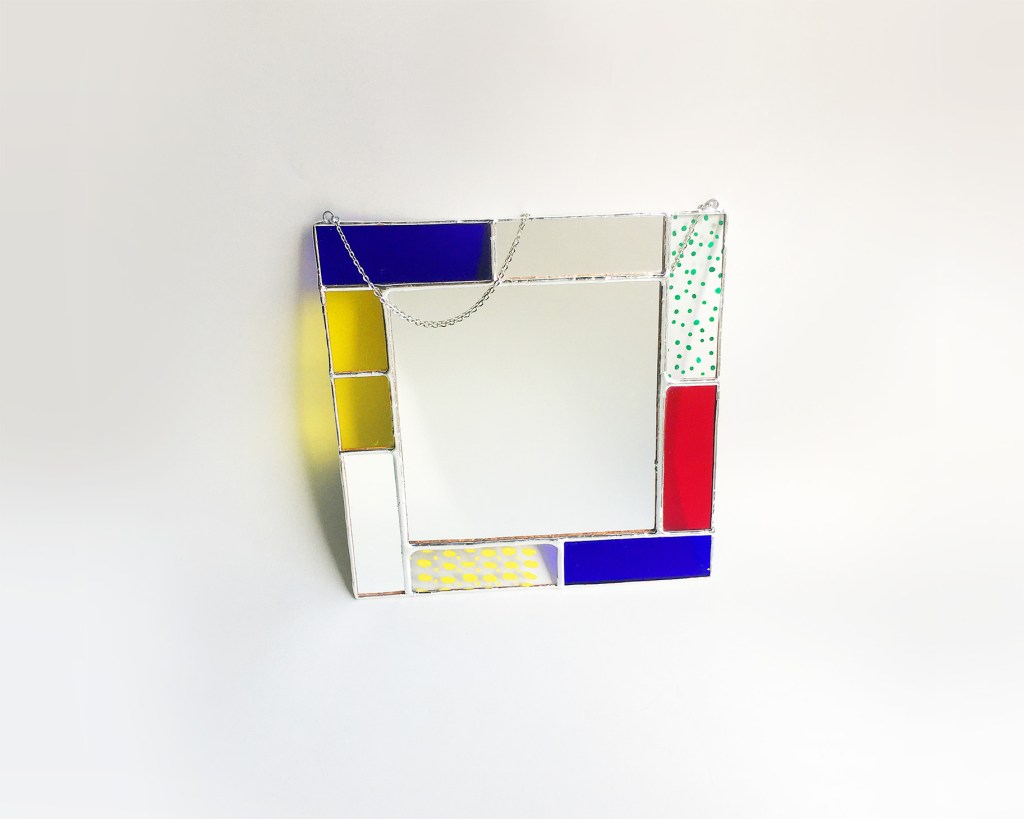 Das Endstück misst 19 × 19 cm und besteht aus einem quadratischen Spiegel, der von verschiedenen Arten farbigen Glases – darunter Ornamentglas, Antikglas und bemaltes Glas – eingefasst ist. Wir arbeiten mit 7 bis 9 Glasstücken, die jeweils einzeln mit Kupferfolie ummantelt und anschließend nach der Tiffany-Technik verlötet werden.